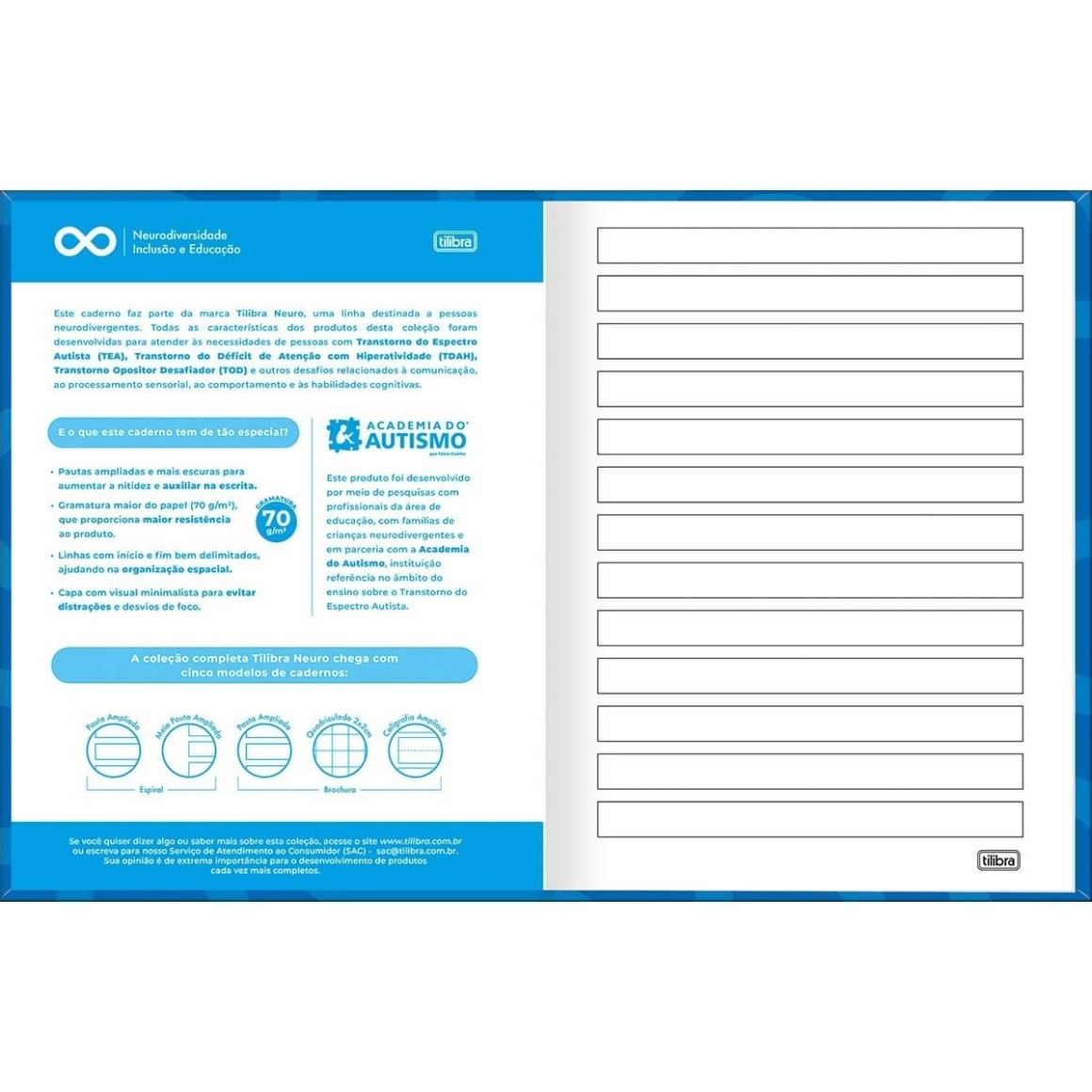 A linha Tilibra Neuro chega para atender as necessidades de crianças e jovens com condições como TEA, TDAH, TOD, entre outras, possibilitando que a aprendizagem aconteça de forma plena para todos. Os cadernos desta coleção apresentam folhas com maior gramatura que os cadernos convencionais e pautações ampliadas para facilitar a usabilidade. Os produtos foram desenvolvidos por meio de pesquisas com profissionais, educadores e famílias de crianças neurodiversas. A Academia do Autismo é parceira da Tilibra neste projeto inclusivo.