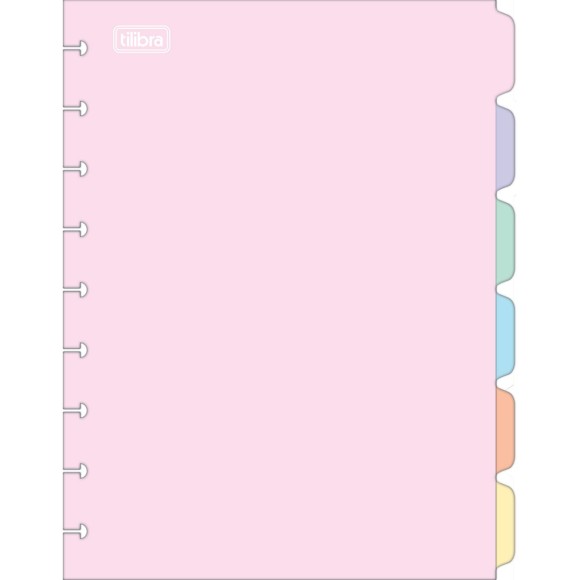 São 6 divisórias diferentes, no formato Colegial, ideais para a organização e separação de matérias nos cadernos Tilidiscos. As Divisórias possuem impressão nas cores rosa, lilás, verde, azul, laranja e amarelo.
