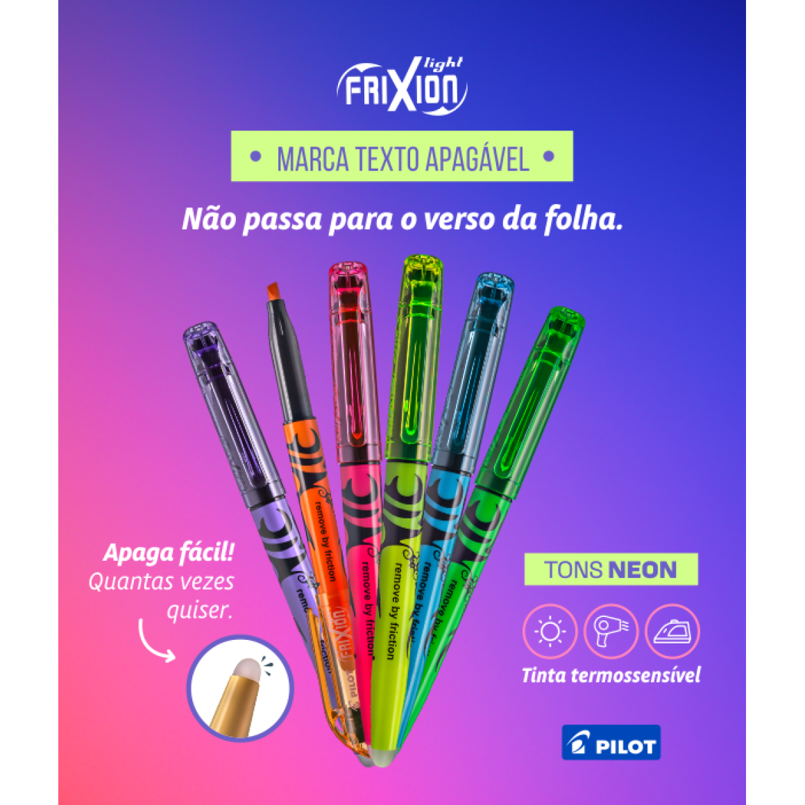 A Pilot apresenta o Marca Texto Apagável Frixion Light Violeta Neon, uma revolução no mundo dos marcadores de texto. Com uma tecnologia inovadora e cores vibrantes, este marcador não apenas destaca informações importantes, mas também permite correções precisas com facilidade.