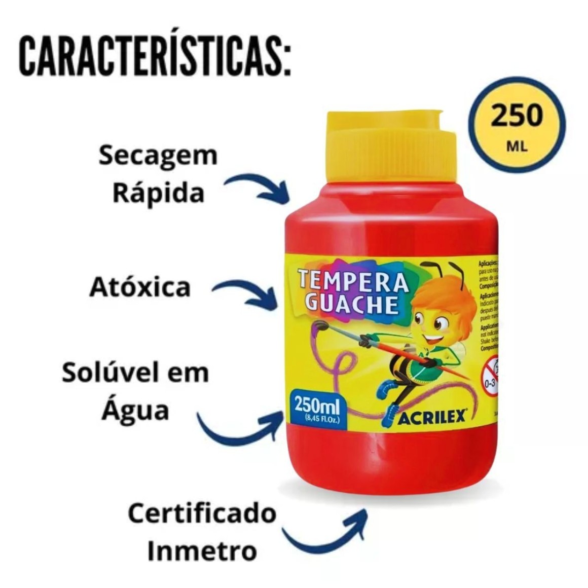 Cores Vibrantes: Quer deixar sua arte incrível? Com o Guache 250ml da Acrilex, suas pinturas vão ganhar vida com cores intensas e super pigmentadas.