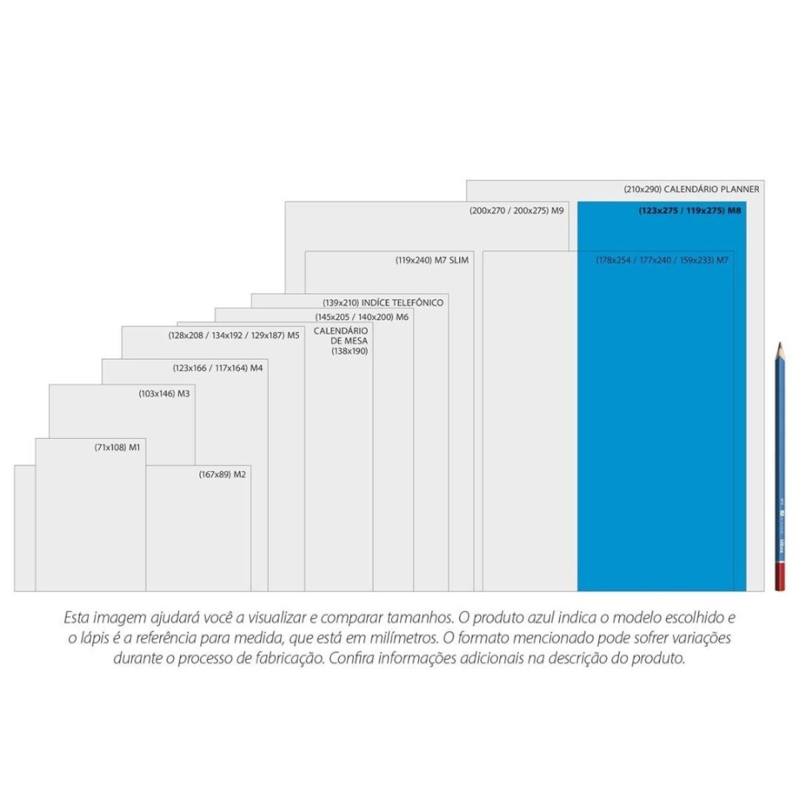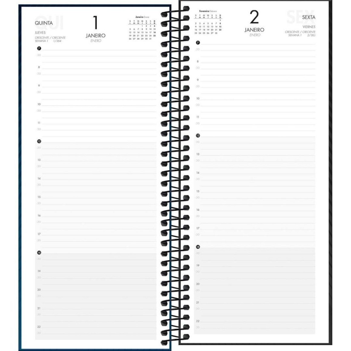 Agenda com páginas diárias: folhas pautadas com horários a cada meia hora, das 7h30 às 22h30. Folhas também possuem calendário mensal e contagem das semanas.
