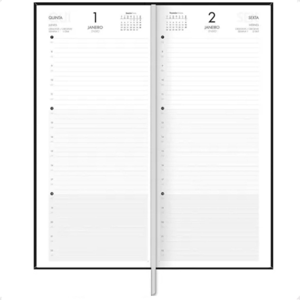 • Agenda com páginas diárias: folhas pautadas com horários a cada meia hora, das 7h às 22h30. Folhas também possuem calendário mensal e contagem das semanas.