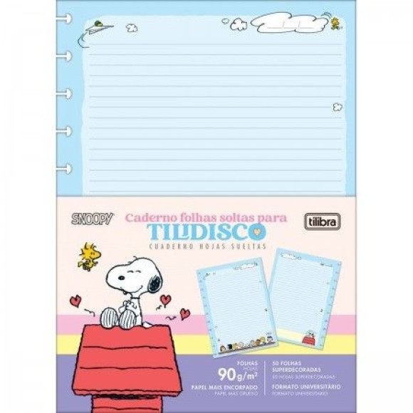 O Refil para Tilidisco Universitário Snoopy 50 Folhas tem gramatura de 90 g/m² para facilitar o encaixe dos discos e oferecer mais possibilidades de escrita com diversos tipos de canetas. Possui folhas pautadas e decoradas. Ideal para o dia a dia na escola ou na faculdade.