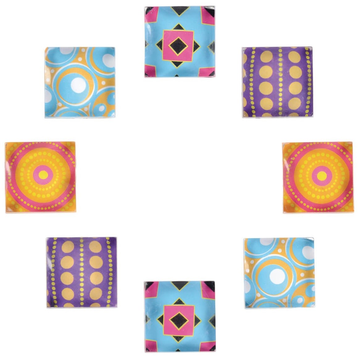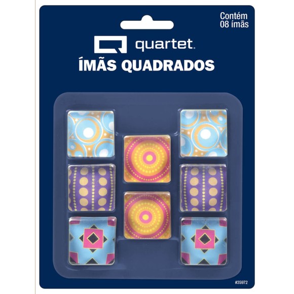 Os ímãs decorados possuem formato quadrado 2,5cm x 2,5cm e acabamento em acrílico, sendo ideais para fixação na maioria das superfícies de metal e quadros magnéticos.