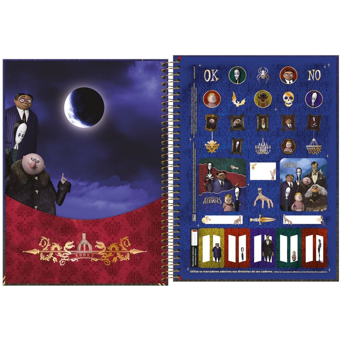 O Caderno Espiral Capa Dura Universitario 1 Matéria Família Addams 80 Folhas possui capa dura com detalhes metalizado, a parte interna decorada, bolsa portifólio para guardar trabalhos e anotações, folha com adesivos funcionais, folhas pautadas e espiral colorido. Ideal para o dia a dia na escola ou na faculdade.