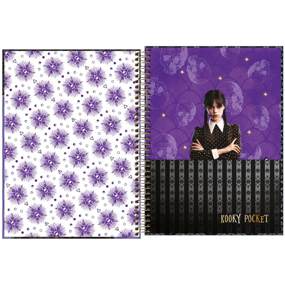 O Caderno Espiral Capa Dura Universitário 1 Matéria Wandinha 80 Folhas possui capa dura com acabamento metalizado, parte interna decorada, bolsa de papel decorada para guardar trabalhos e anotações, folha com adesivos funcionais e folhas pautadas. Ideal para o dia a dia na escola ou na faculdade.