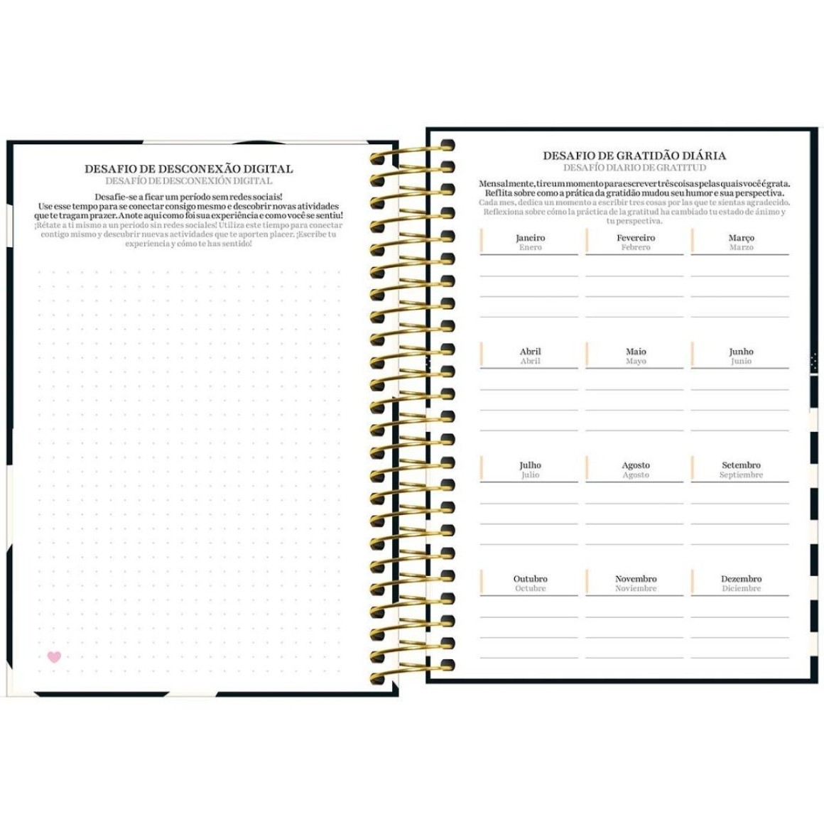 9. Aberturas mensais: 12 páginas com espaço para indicar hábitos que deseja adquirir ou manter ao longo do mês, playlist do momento e avaliação de desejos e reais necessidades.