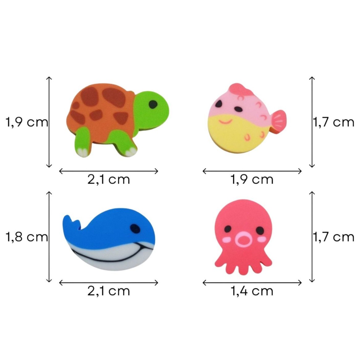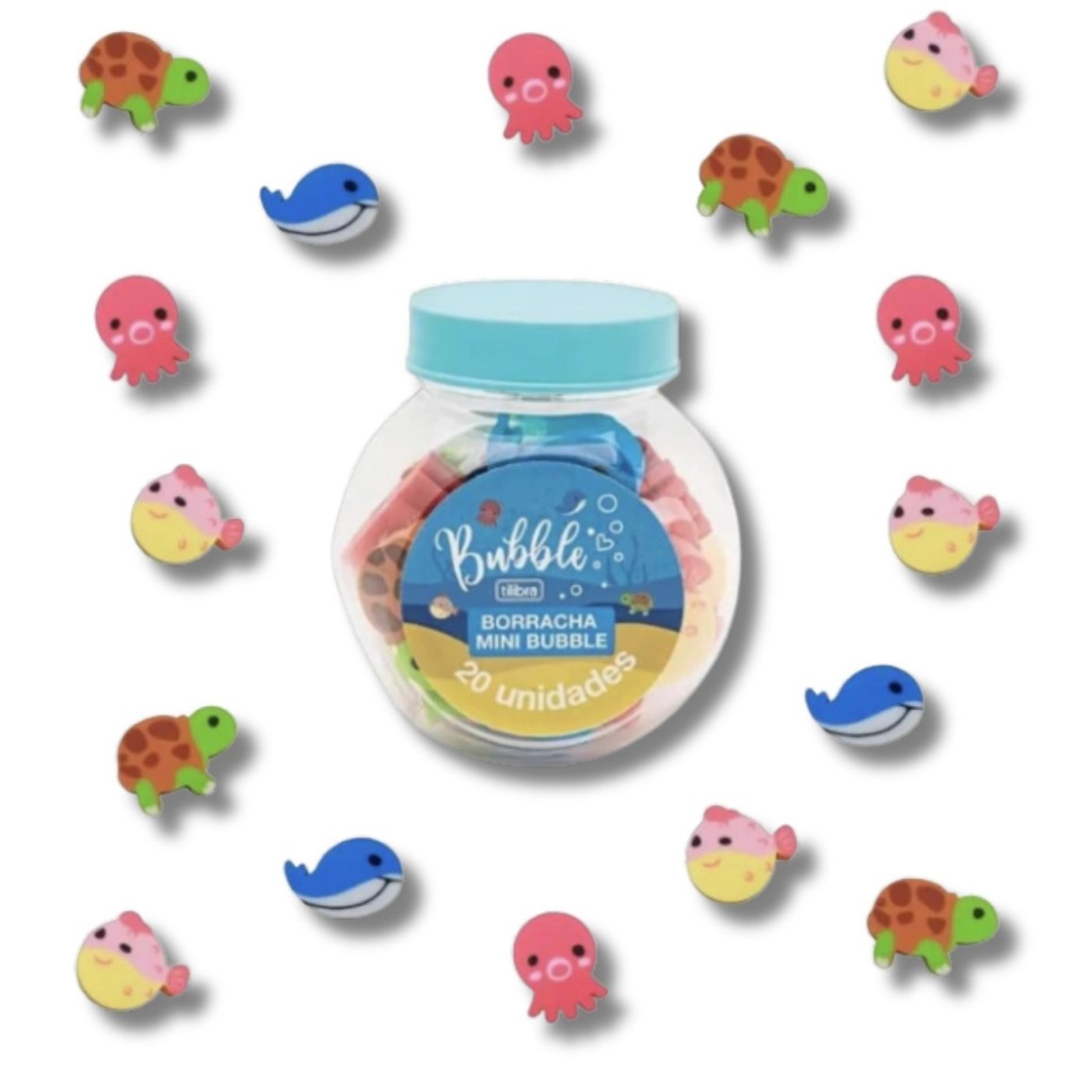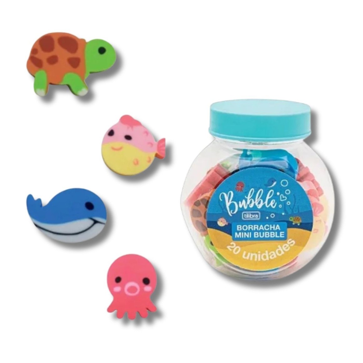 Borracha Mini Fantasia bublle, da Tilibra. Mini borrachas super fofas em formato de animais para você se divertir! Apaixone-se por essas borrachinhas no formato de tartaruga, baleia, polvo e baiacu! Esqueça-se da sujeira ao tentar apagar algo do seu caderno! A Borracha Mini Bubble é macia e apaga tudo de maneira eficiente! Sua fórmula é livre de produtos tóxicos, como o ftalato, garantindo maior segurança durante o uso. Ideal para o dia a dia escolar.