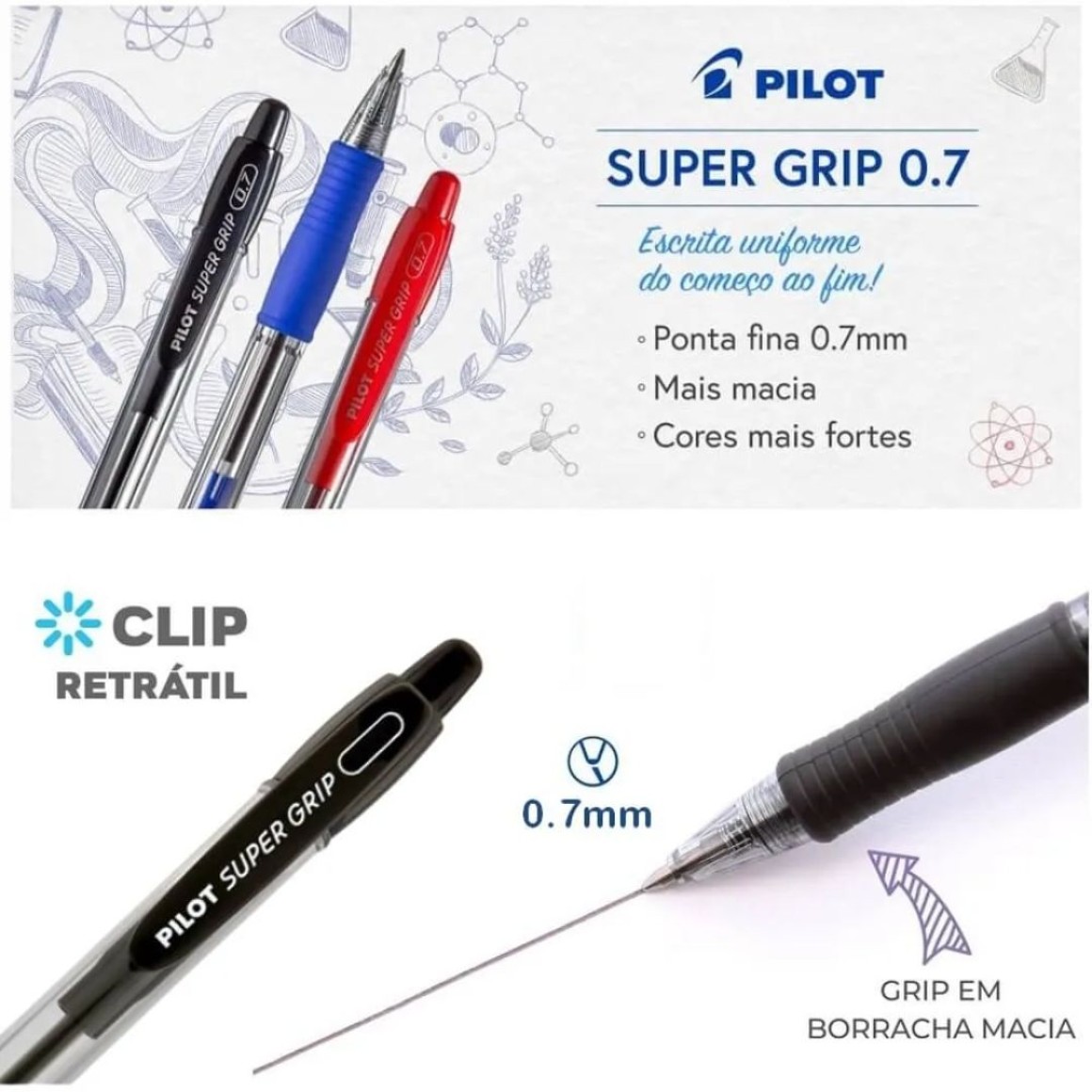 Caneta esferográfica Pilot Super Grip 0.7mm Retrátil, com corpo arredondado e grip em borracha anatômica.