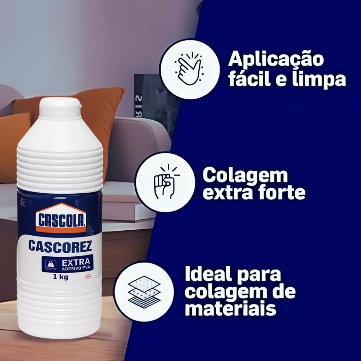 A Cola Líquida Branca Extra PVA Cascorez 1Kg da Cascola é perfeita para quem precisa de uma proteção super resistente e versátil! Com fórmula extra forte à base de PVA, é ideal para projetos que exigem alta fixação e flexibilidade, como trabalhos com madeira, laminados decorativos, plásticos, papel e papelão.