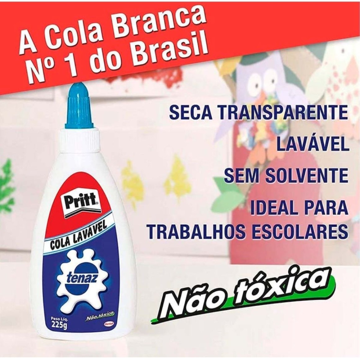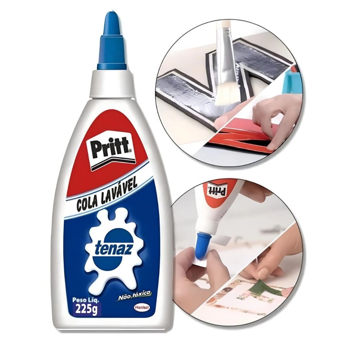• A Pritt Tenaz é uma cola líquida que se aplica branca e seca transparente.