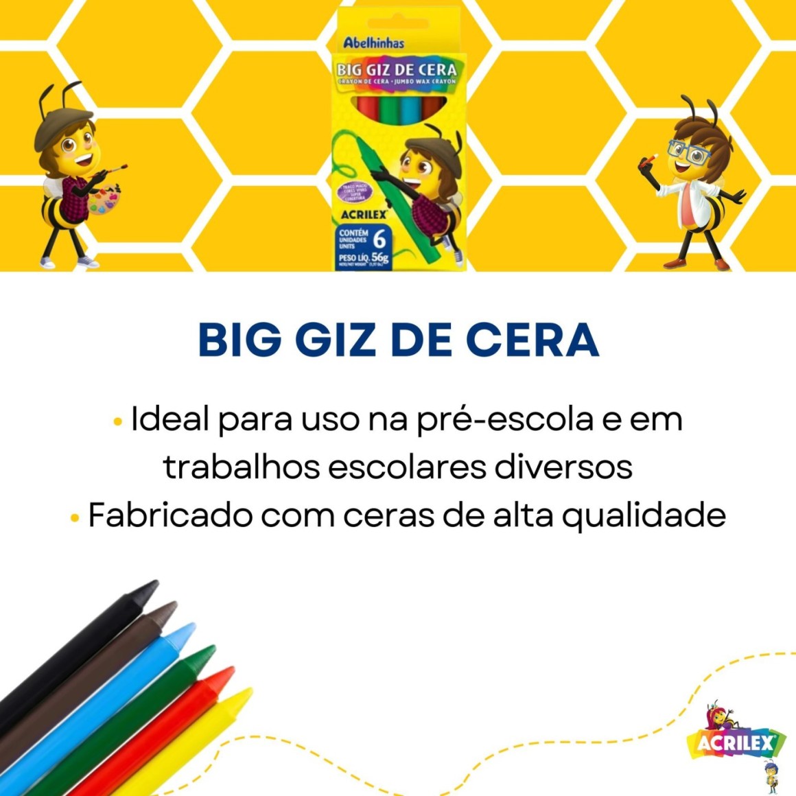 Perfeito para trabalhos escolares ou para liberar a imaginação em casa, o Giz de Cera Jumbo Big Acrilex vai transformar cada traço em pura diversão e cor!
