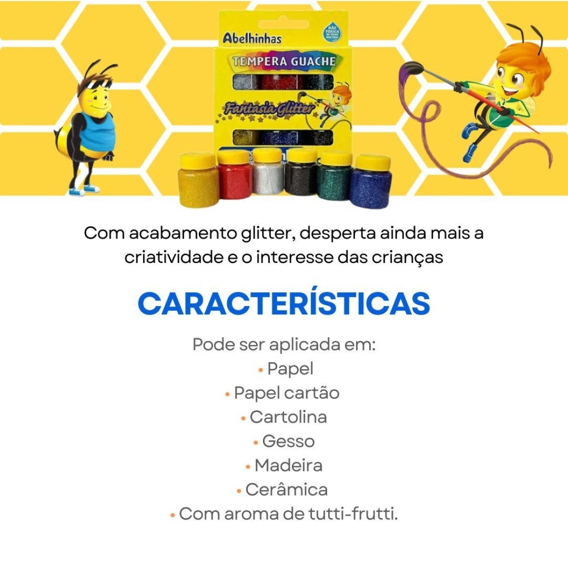 Cores que Brilham: Este kit de guache com 6 cores brilhantes e cheias de glitter é perfeito para liberar sua criatividade e dar aquele toque mágico aos seus projetos artísticos. As cores fantasia são vibrantes, ideais para criar pinturas que se destacam!