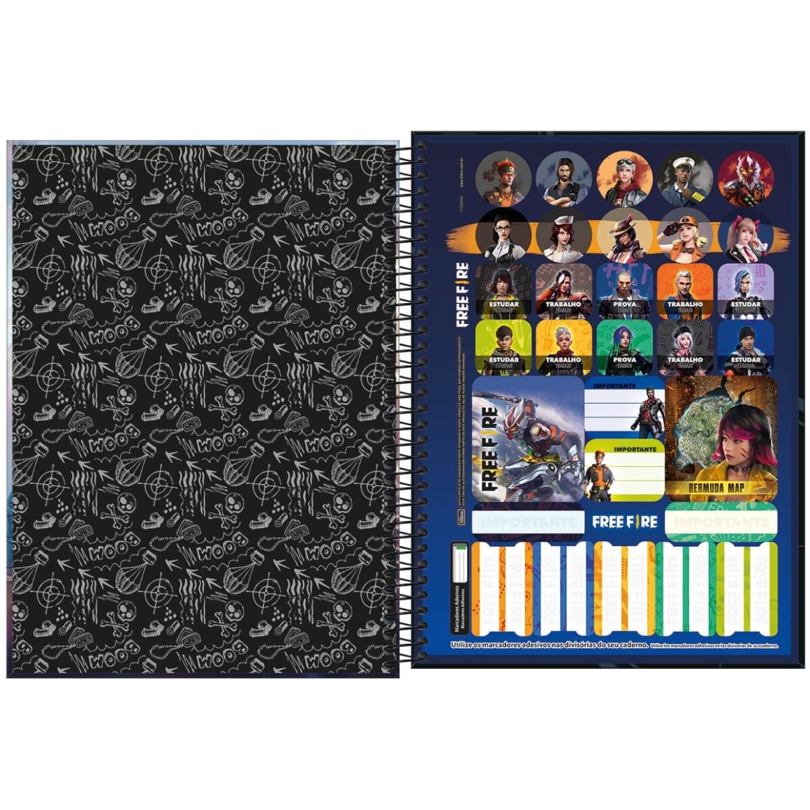 O Caderno Espiral Capa Dura Universitário 16 Matérias Free Fire 256 Folhas possui capa dura com a parte interna decorada, bolsa plástica para guardar trabalhos e anotações, folha com adesivos funcionais, folhas pautadas e espiral colorido. Ideal para o dia a dia na escola ou na faculdade.