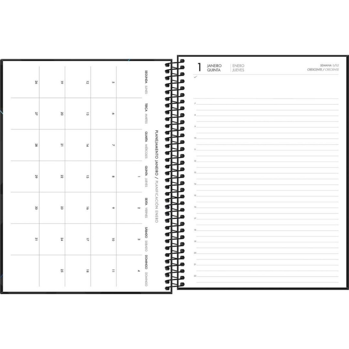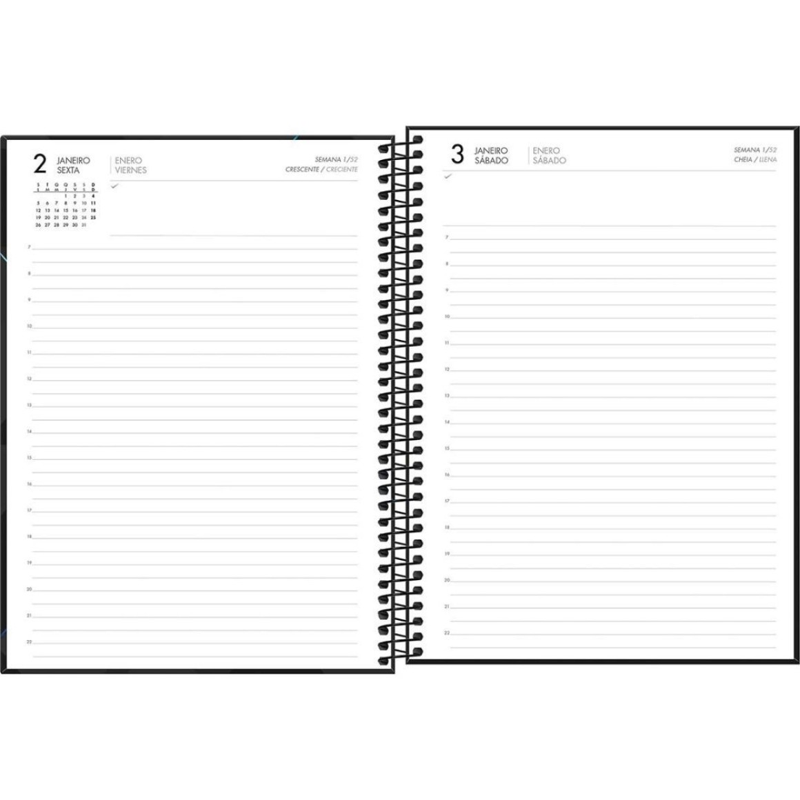 4. Layout Funcional: Cada página é cuidadosamente projetada para oferecer amplo espaço para anotações diárias, compromissos e metas, mantendo sua vida organizada e produtiva.